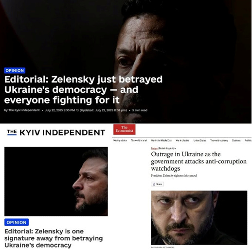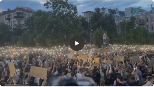 6. Aujourd'hui, Zelenskyy a soumis au Parlement un projet de loi proposant de supprimer l'indépendance du NABU et du SAPO en les plaçant sous l'autorité directe du procureur général. Cela signifierait qu'ils ne seraient plus en mesure d'enquêter sur la corruption du gouvernement, et que le procureur général pourrait clore toute affaire par décret. Étant donné que la quasi-totalité de la corruption se situe au sein du gouvernement, cette mesure aurait pour effet d'anéantir ces institutions. Pour rappel, le procureur général nommé par Zelenskyy n'a pas réussi le test d'intégrité et ne pouvait même pas prétendre à un poste de procureur ordinaire en raison d'allégations de corruption antérieures. Sa nomination a été le premier scandale qui a déclenché tout cela. Tous les organismes internationaux de lutte contre la corruption et tous les groupes de la société civile ukrainienne ont averti que l'adoption de cette loi pourrait mettre fin au processus d'adhésion de l'Ukraine à l'UE, annuler son régime d'exemption de visa et même déclencher des sanctions de l'UE à l'encontre de l'Ukraine. Mais cela n'a pas arrêté les députés de Zelenskyy, qui détiennent la majorité parlementaire et n'ont pas besoin d'autres factions pour adopter des lois. La loi a été adoptée. Le blocage de la tribune parlementaire n'a rien arrangé. Même les tentatives de destitution du président du Parlement pour avoir violé la procédure en inscrivant le projet de loi de Zelenskyy à l'ordre du jour ont échoué.