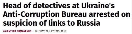 5. Quelques jours plus tard, 70 perquisitions simultanées ont été menées au NABU et au SAPO, toujours dans l'illégalité et sans mandat de justice. Officieusement, la raison invoquée était la recherche d'un agent russe qui avait aidé un officier du FSB et un ancien député de Yanukovych (qui, pour une raison ou une autre, était toujours membre du parlement !) à fuir l'Ukraine. Mais les documents officiels indiquaient que les recherches concernaient un accident de voiture vieux de 3 ou 4 ans, au cours duquel un employé du NABU avait prodigué les premiers soins aux blessés. La vraie raison ? Le NABU avait lancé une enquête sur l'ancien patron de Zelenskyy, à l'époque où il était comédien, qui avait fui l'Ukraine avec le bras droit de l'oligarque Kolomoisky (le même Kolomoisky qui a porté Zelenskyy au pouvoir et qui est aujourd'hui emprisonné). Le NABU dénonce aussi régulièrement des agents russes au sein du SBU - en fait, un autre a été arrêté aujourd'hui même. Ces raids ont été menés par le SBU sur ordre direct de Zelenskyy. Ils ont affirmé avoir découvert un agent russe au sein du NABU. Cela n'a rien de surprenant : les agents russes sont omniprésents. Mais cet incident a déclenché une réaction internationale. Hier soir, le G7 a critiqué le gouvernement ukrainien pour la persécution du NABU et du SAPO et a demandé une réunion urgente. La délégation de l'Union européenne en Ukraine a publié un message plus soft, affirmant que l'Ukraine avait mis en œuvre de nombreuses réformes anticorruption et invitant le gouvernement à ne pas les détruire.